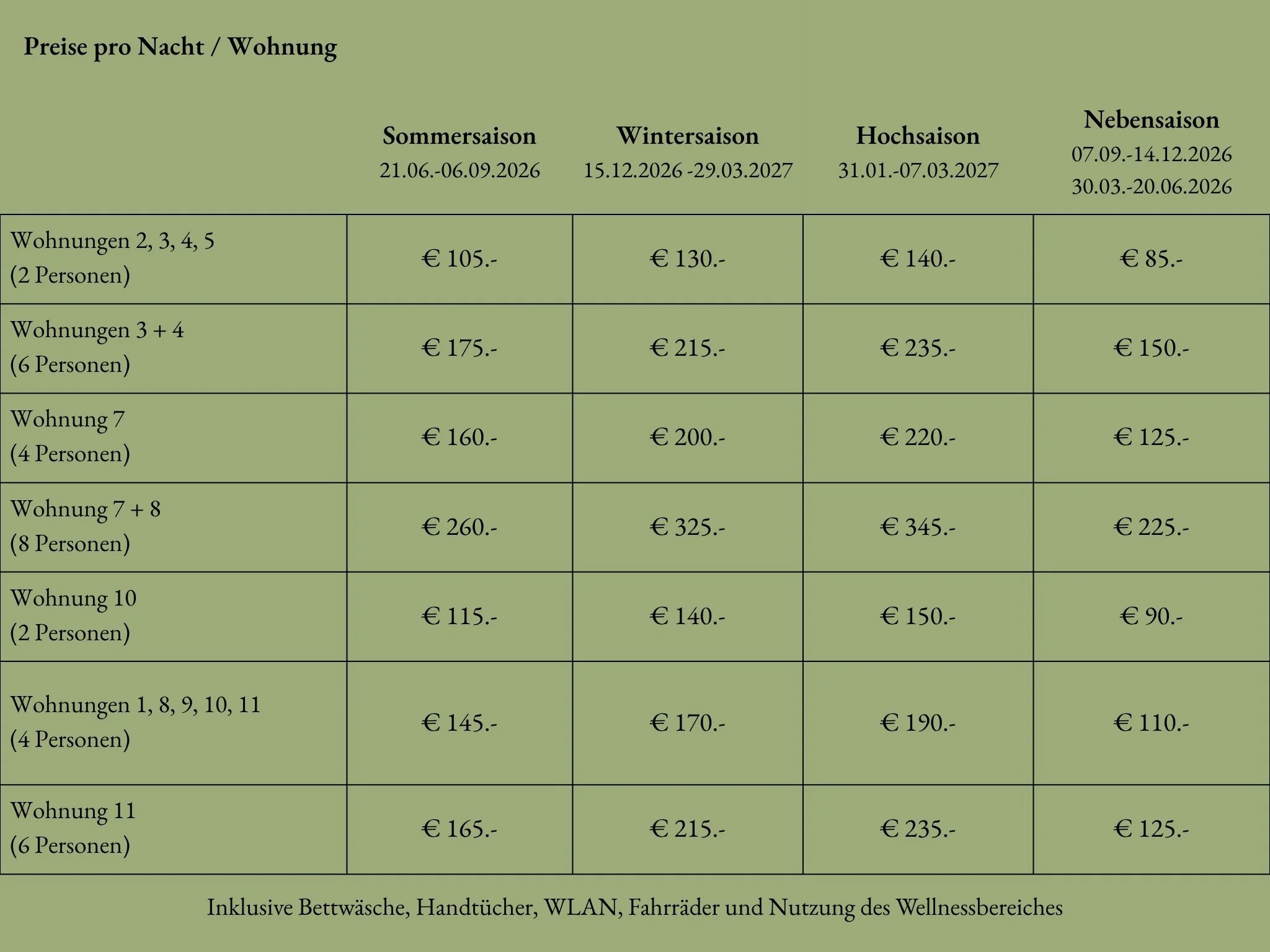 Haustiere: Haustiere sind nur in den Wohnungen 8, 9, 10 und 11 erlaubt. Die Pauschale beträgt Euro 50,- pro Aufenthalt und pro Haustier.